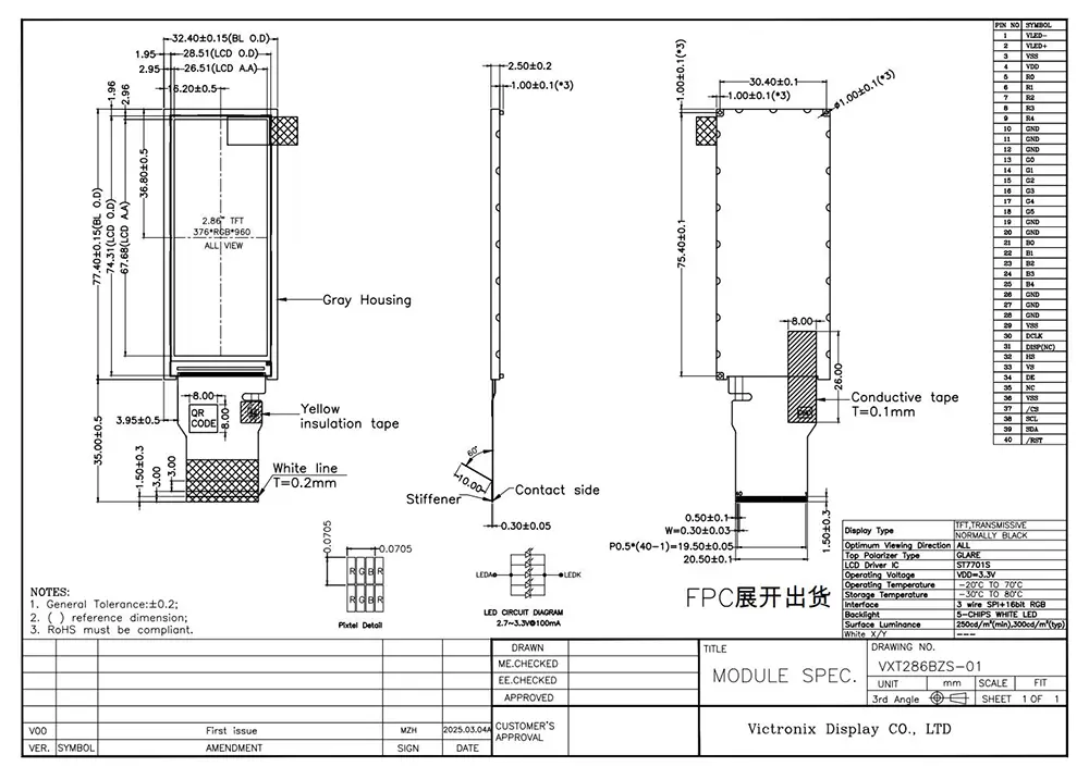 V dobi inteligence nam modul TFT omogoča vizualno predstavitev potrebnih podatkov. Kakovost modula TFT ima ključnega pomena na njegovo uporabo. Kakšne so prednosti modula Victronix 2,86 palca 376 × 960 IPS TFT? Sprva njegova 300 cd/m² svetlost, kontrastno razmerje 1500: 1, 85 -stopinjski kot gledanja v vse smeri in 80% enakomernost zagotavljajo žive posnetke. Drugič, podpira vmesnik RGB SPI+16-bitni RGB s ST7701 in 5-DI-jem belo LED osvetlitve z življenjsko dobo od 30.000 do 50.000 ur, kar zagotavlja dolgoročno uporabnost v različnih industrijskih aplikacijah. Poleg tega ustreza standardom ROHS in uspešno opravi stroge teste zanesljivosti, vključno s toplotnim šokom, vlažnostjo in zaščito ESD do 8 kV zraka in 4KV stika. Ta izdelek deluje učinkovito pri ekstremnih temperaturah, ki segajo od -20 ° C do +70 ° C in lahko prenese hude pogoje skladiščenja od -30 ° C do +80 ° C.