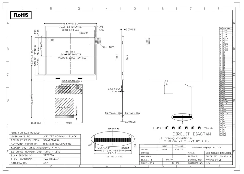 TFT LCD je vrsta tekočega kristalnega zaslona, ki za izboljšanje kakovosti slike uporablja tanko-film tranzistorsko tehnologijo in ima številne aplikacije v vsakdanjem življenju. Kot profesionalni proizvajalec in dobavitelj modula TFT na Kitajskem, kaj je Victronix 3,5 palčni 320 × 240 QVGA IPS TFT modul, ki se razlikuje od drugih proizvajalcev? Prvič, ponuja tipično svetlost 300 CD/m², široke 80 ° kote gledanja v vse smeri in kontrastno razmerje 800: 1, kar zagotavlja odlično berljivost iz različnih zornih kotov. Drugič, združuje enoto za ozadje, ki uporablja 6S bele LED s tipično življenjsko dobo od 30.000 do 50.000 ur (do 50% začetna svetlost), kar zagotavlja jasno vidljivost v vseh svetlobnih pogojih. Poleg tega podpira RGB 24-bitni vmesnik s krmilnikom ST7272A. Poleg tega opravi strogo okoljsko testiranje, vključno s toplotnim šokom (-30 ° C ↔ +80 ° C ciklov), shranjevanjem vlažnosti (60 ° C/90% RH) in mehansko vibracijo, s čimer lahko zagotovi brezhibno v podaljšanem temperaturnem območju (-20 ° C do +70 ° C).