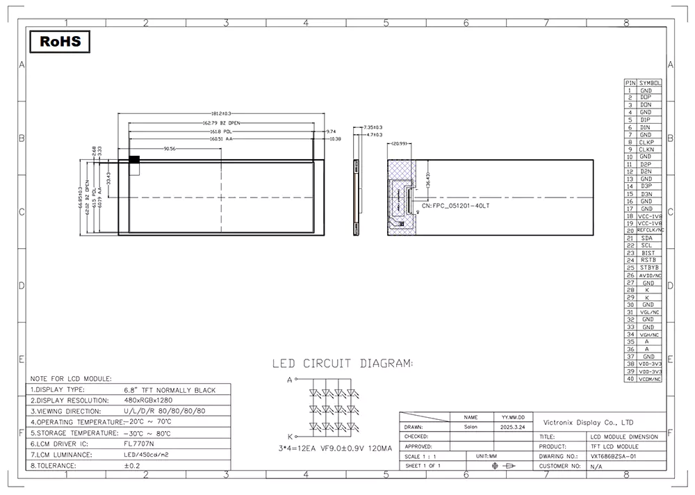 TFT LCD je vrsta tekočega kristalnega zaslona, ki za izboljšanje kakovosti slike uporablja tanko-film tranzistorsko tehnologijo in ima številne aplikacije v vsakdanjem življenju. Kot profesionalni proizvajalec in dobavitelj modula TFT na Kitajskem, kaj naredi Victronix 6,86 palčni 480 × 1280 IPS TFT modul, ki se razlikuje od drugih proizvajalcev? Sprva ponuja tipično svetlost 450cd/m², 16,7 m barv, širok kot gledanja 80 ° (značilno) v vseh smereh in kontrastno razmerje 800: 1, kar zagotavlja odlično berljivost iz različnih zornih kotov. Drugič, združuje enoto za ozadje, ki uporablja 3 × 4 bele LED s tipično življenjsko dobo od 30.000 do 50.000 ur (do 50% začetna svetlost), kar zagotavlja jasno vidljivost v vseh svetlobnih pogojih. Poleg tega uporablja 4-palčni vmesnik MIPI DSI za prenos hitrih podatkov in poenostavljeno integracijo. Poleg tega opravi strogo okoljsko testiranje, vključno z visoko/nizko temperaturo shranjevanja in delovanjem, temperaturno kolesarjenjem, preskusom vlažne toplote (vlažnosti), tako da lahko brezhibno deluje v podaljšanem temperaturnem območju od -20 ° C do +70 ° C.